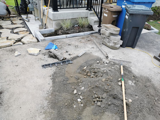 Nivelage de terrain : terrasse et chemin en dalles Mondrian, installation gazebo, boite de plantation