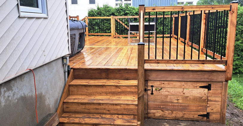 Terrasse en hauteur, longue jupe, escalier, espace de rangement etrampes de sécurité en bois traitées